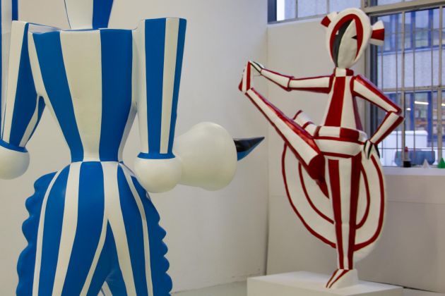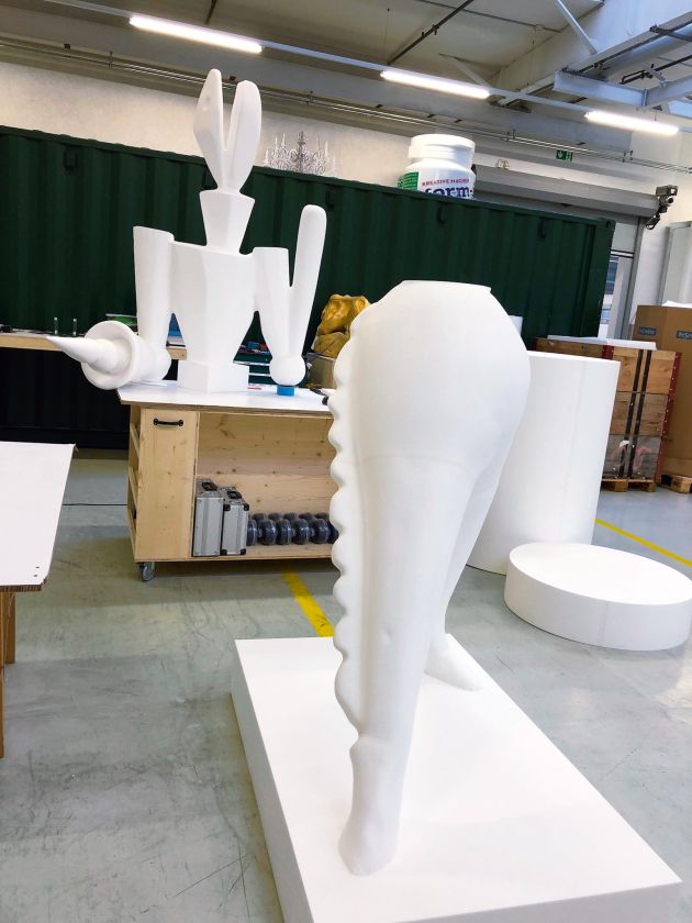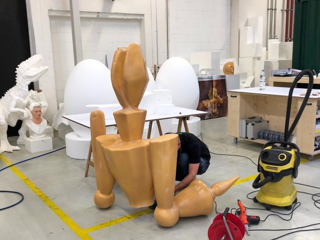 Die beiden Figuren wurden aus verarbeitetem, gehärtetem und foliertem Styropor ausgearbeitet, das wir auf Konturen gefräst und geschliffen haben.