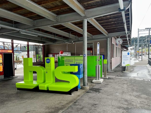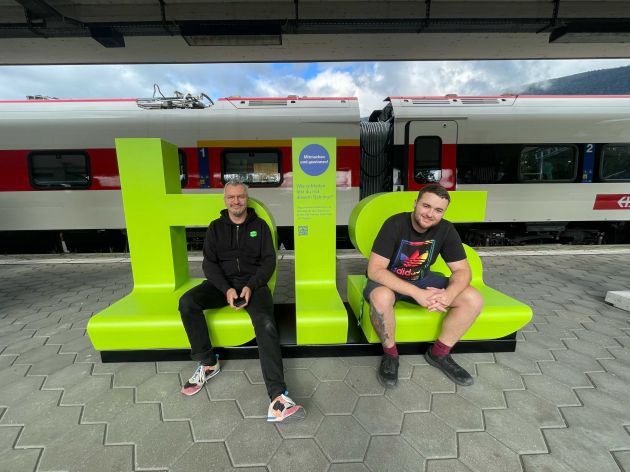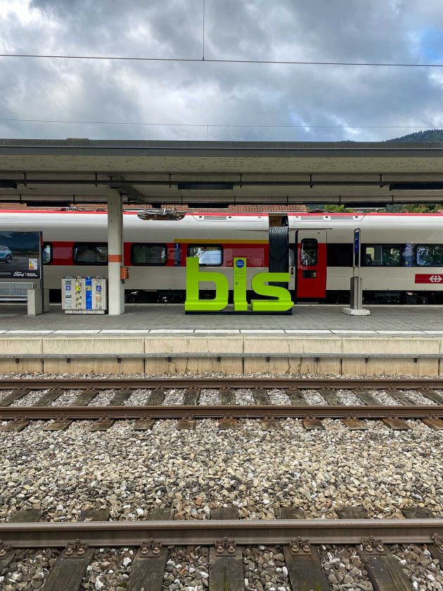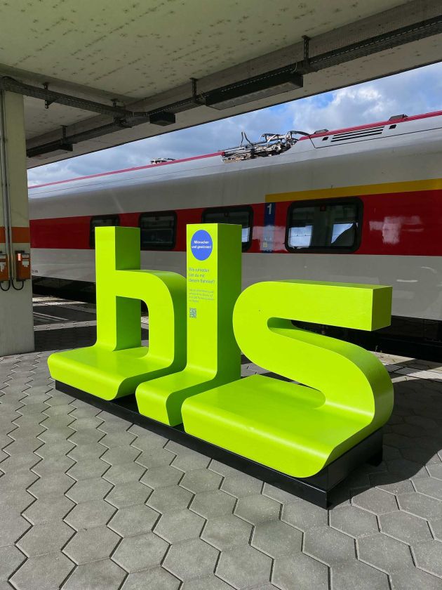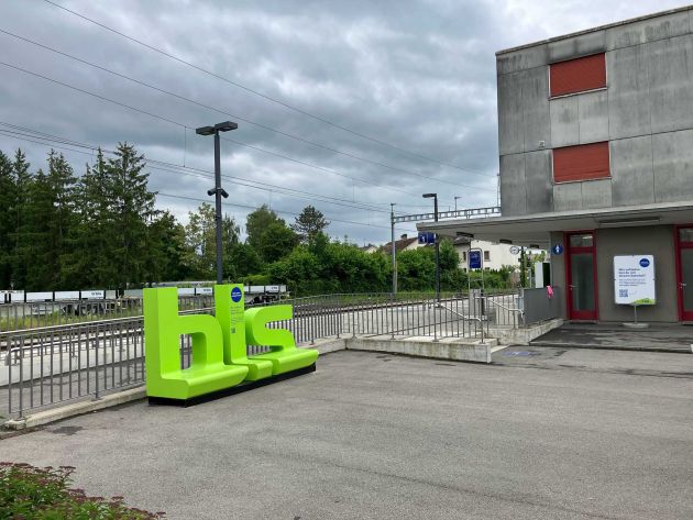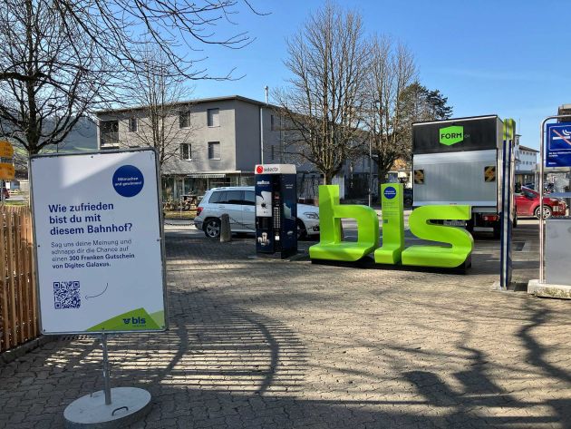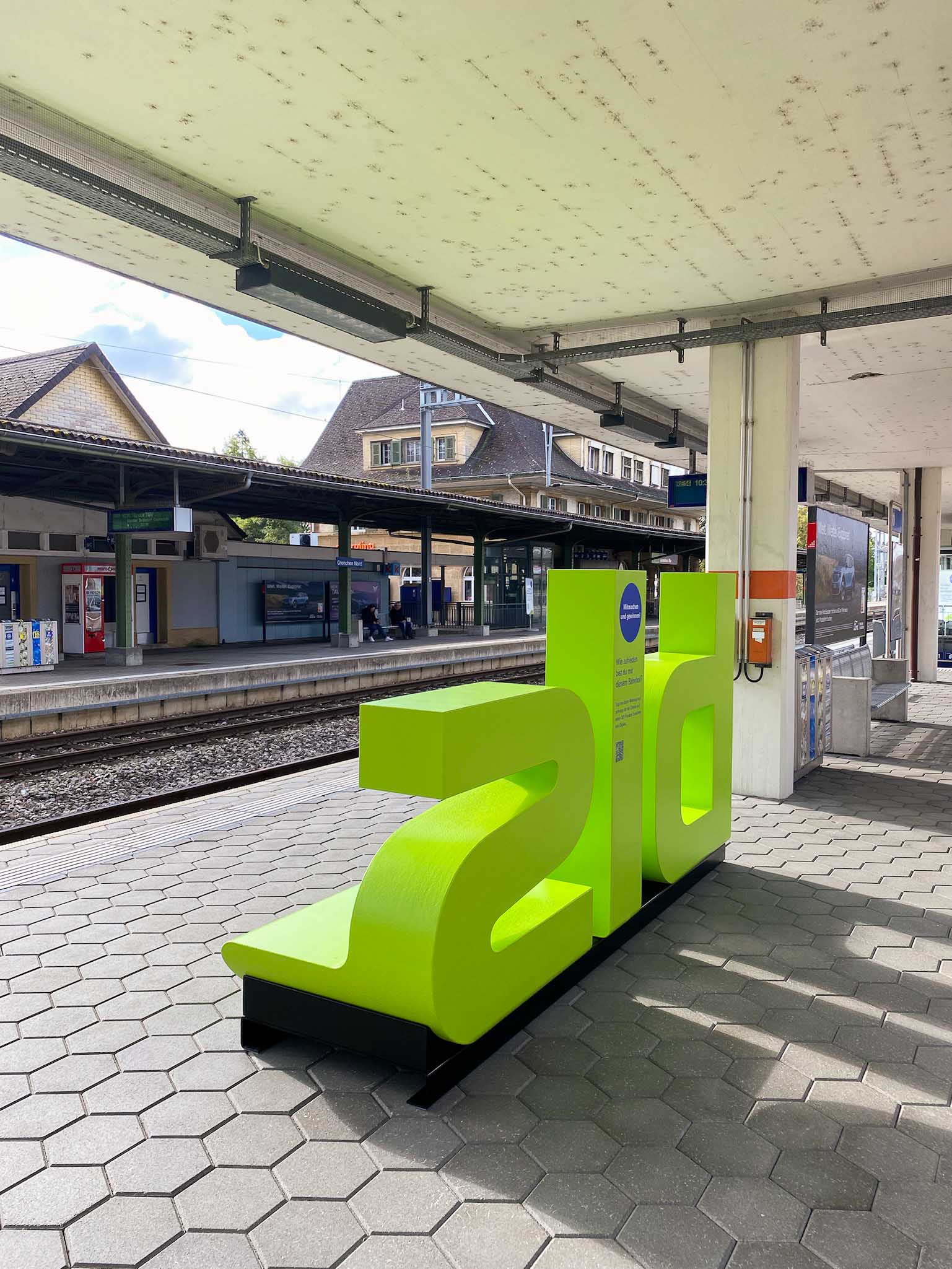 Ein Bänkli auf Reisen: Von Bahnhof zu Bahnhof zieht das grüne Objekt die Blicke auf sich – auffällig, wetterfest und Teil einer Kampagne zur Zufriedenheit an BLS-Bahnhöfen.