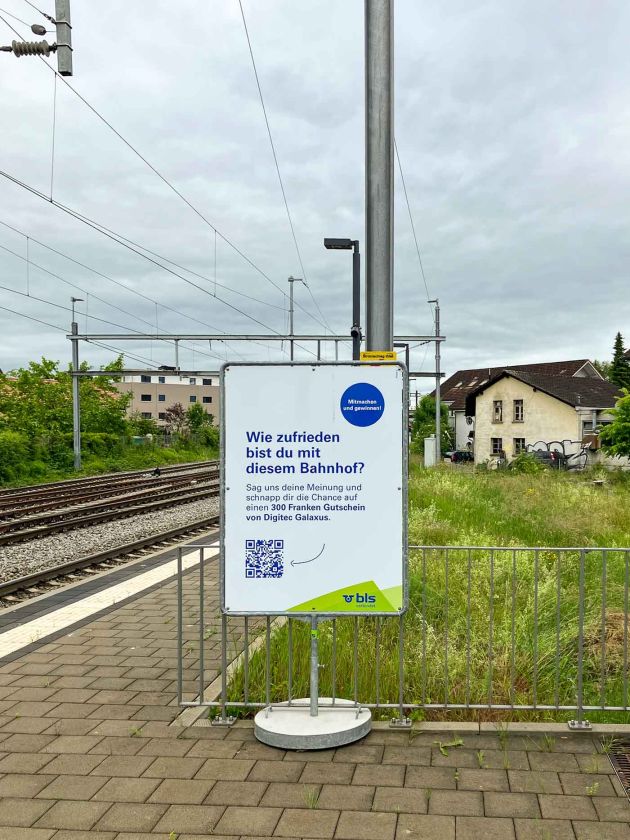 Durch die spezielle Form und die knallige Farbe wird es zum Blickfang und lädt Passant:innen zum Verweilen ein. Dank des dazugehörigen Plakatträgers konnte die Umfragekampagne direkt integriert werden. Das Bänkli war schon an mehreren Bahnhöfen in der Schweiz im Einsatz, jedes Mal neu platziert und fest im Boden verankert – ein flexibles Objekt, das Mobilität und Markenbotschaft clever verbindet.