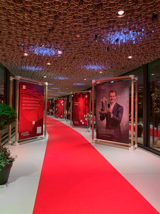 Seit 2021 dürfen wir bei der Konzeptionierung und Mitgestaltung des Raum- und Bühnenbildes der Award-Verleihung von Prix Suisse mitwirken. Vom Empfangsbereich über das Bühnenbild bis zur Ambiance können wir unsere Kreativität walten lassen.