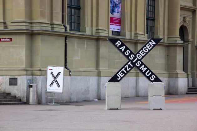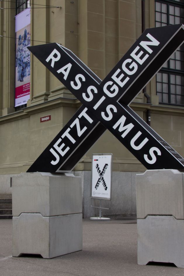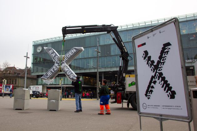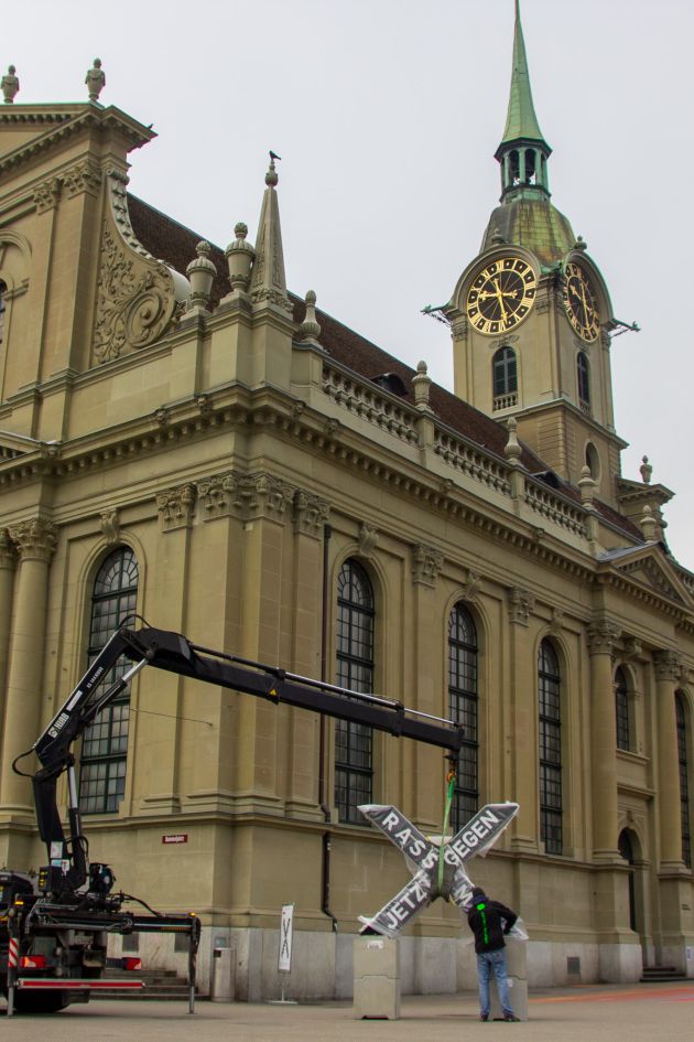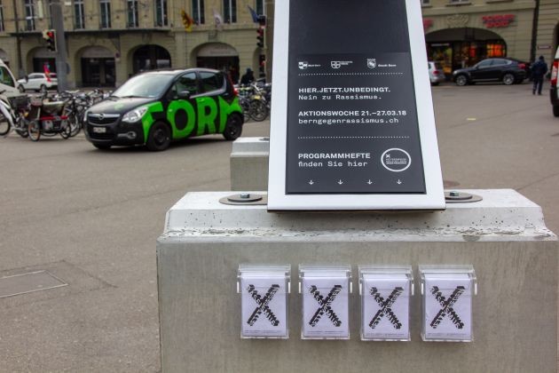 Zur jährlichen Arbeitswoche „Bern gegen Rassismus“ fertigten wir wetterfeste Kreuze aus ausgehärtetem Styropor. Diese symbolisierten den Slogan der Kampagne „Jetzt gegen Rassismus“.