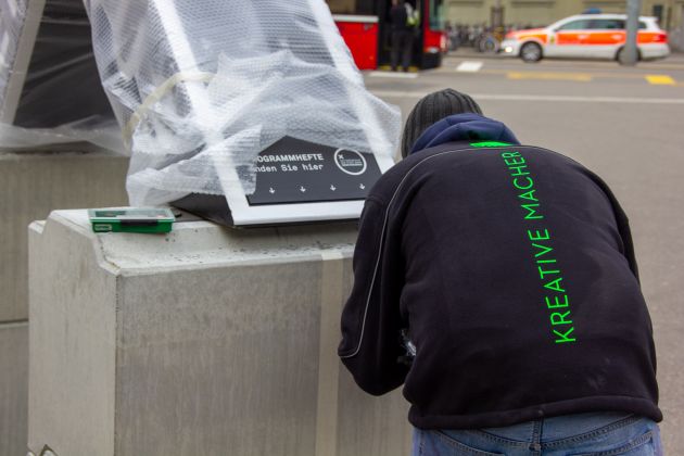 Mit dem Ziel der Wahrnehmung durch Passantinnen und Passanten haben wir mehrere grosse schwarze Kreuze designt und produziert. Damit die Styroporkreuze, Wind, Regen, Wärme und Kälte standhalten können, haben wir diese mit einer wetterfesten Beschichtung lackiert. Für die Farbgebung anschliessend mit schwarzem Lack eingefärbt und weissem Folienplott beschriftet. Um genügend Stabilität zu erhalten, wurden die grossen Kreuze auf Betonsockel befestigt.