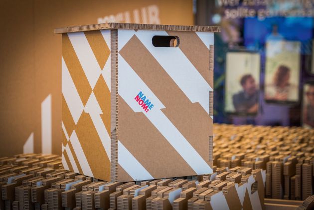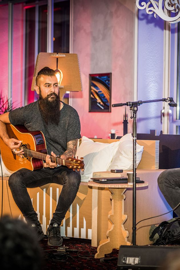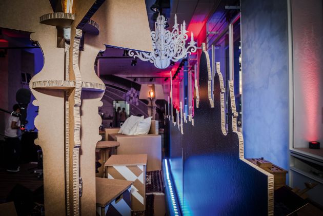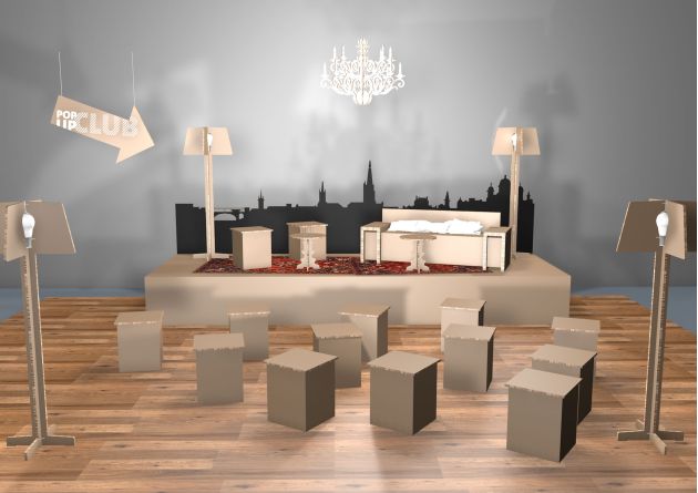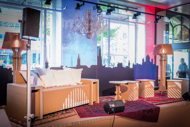 Bühnenbild, Mobiliar und Konzertbestuhlung aus bedrucktem Karton - so umgesetzt im pop-up Club - Swisscomshop am Bubenbergplatz in Bern.