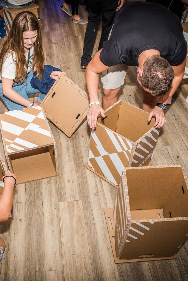 Nebst der gesamtem Eventorganisation, haben wir eine komplette Bühne inklusive Bühnenbild und einem persönlichen Hocker für alle Konzertbesuchende produziert. Wir wählten dafür stabiles Ökoboard, welches ein Recycling-Produkt ist aus. Die Hocker konnten von den Besucherinnen und Besucher am Eingang bezogen und selbst zusammengebaut werden, wer mochte durfte diesen am Ende des Abend gerne mit nachhause nehmen.