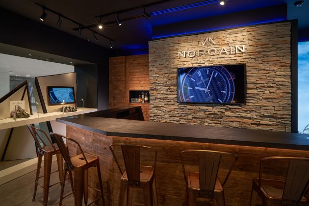 The warm materials used in the chalet-style shops, with their wood and stone look, contrast with the modern, cooler materials such as pearlescent aluminum and the white tabletop, which symbolizes the snow line. The watches are displayed on 3D-printed displays inspired by and designed after the polygonal landscapes of the mountain world. The overall concept and design reflect the outdoor spirit of the Norqain brand.